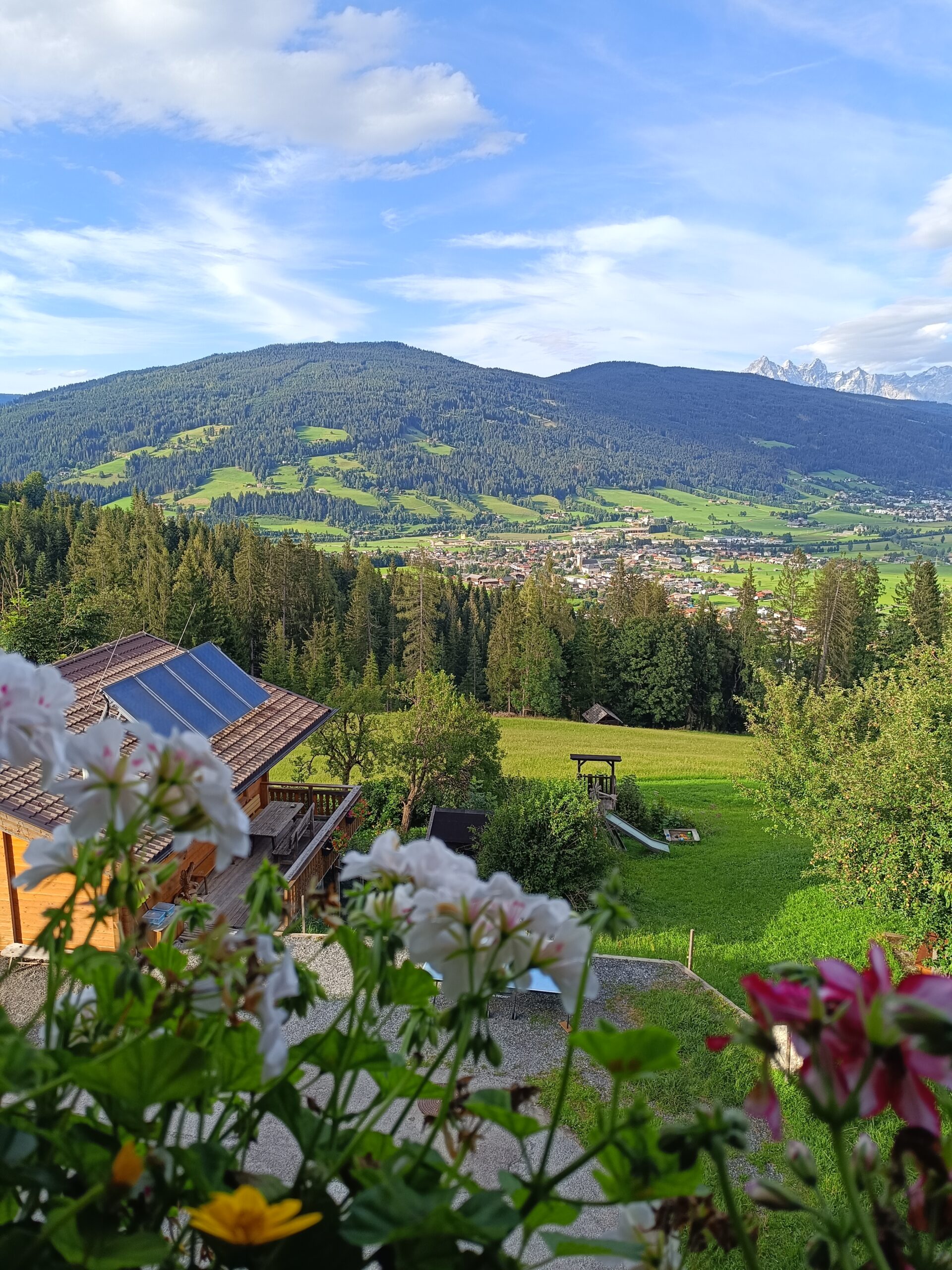 Inmitten blühender Wiesen und mit Blick auf das Ennstal und den Dachstein fällt es nicht schwer, den Alltag hinter sich zu lassen und die urige Gemütlichkeit auf unserem Hof zu genießen.